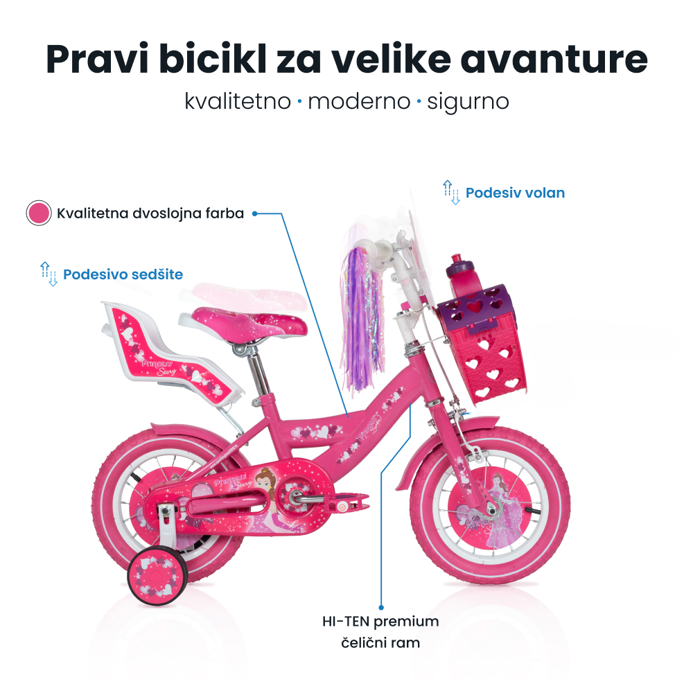 Ovaj bicikl je savršen poklon za svaku devojčicu uzrasta od 2 do 4 godine. Njegova prednja korpa u obliku srca i ugradna flašica za vodu u sklopu korpe čine ga ne samo funkcionalnim, već i izuzetno šarmantnim. Dizajn sa niskim prelazom omogućava jednostavno penjanje i silazak, pružajući detetu potpunu slobodu da uživa u vožnji sa lakoćom i sigurnošću.
