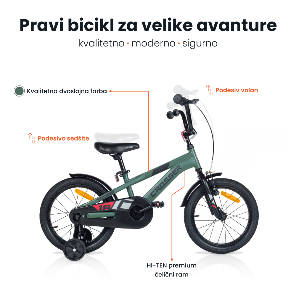 Uplovite u svet avanture sa našom sportskom 16-inčnom biciklom dizajniranom za avanturiste od 3 do 5 godina.Ovaj dečiji bicikl je savršen spoj stila i funkcionalnosti.Ova dečija bicikla dolazi sa ramom najmodernijeg dizajna do sada i u atraktivnoj mat zelenoj boji.